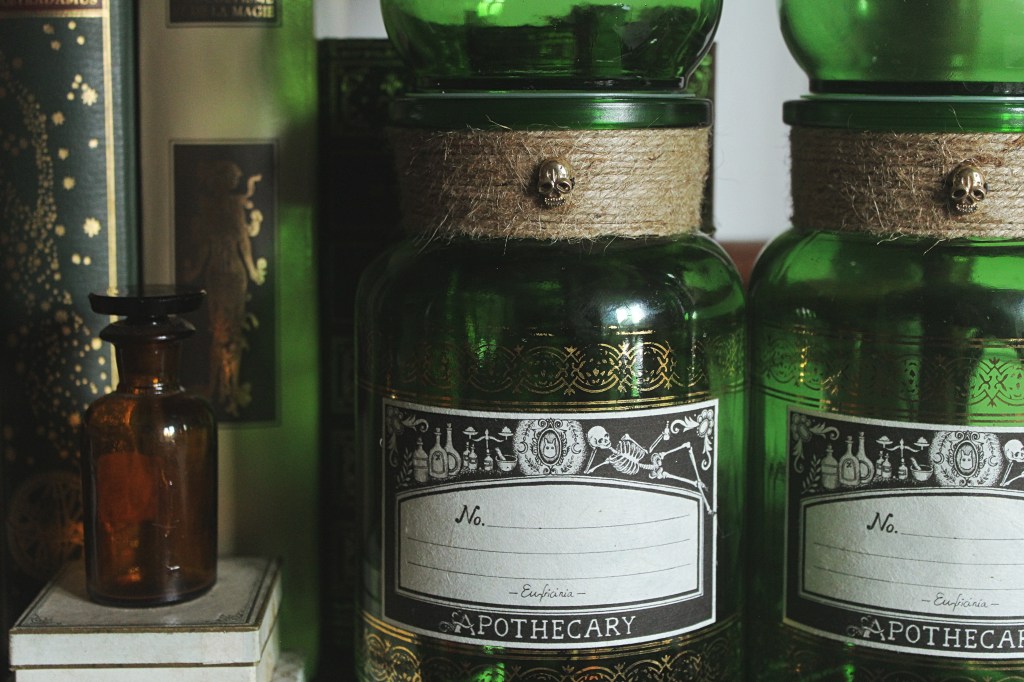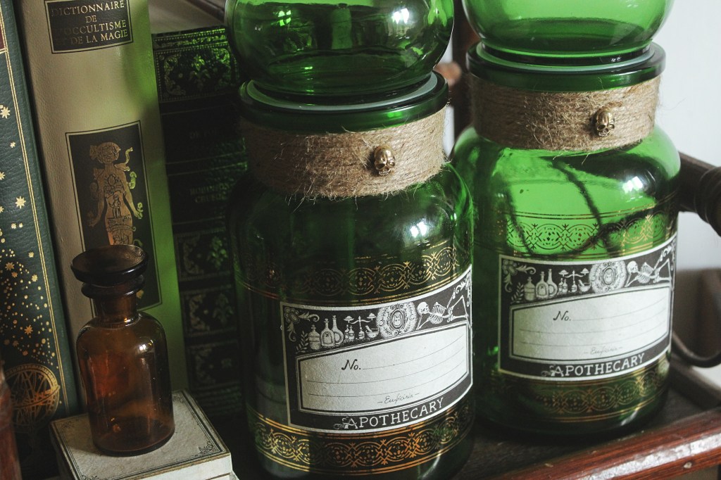 Voici donc ces bocaux, que l’on peut voir et trouver assez facilement en cherchant. J’en ai donc plusieurs à vous proposer et j’ai choisi de les décorer d’un col en fil de lin et d’un crâne doré pour souligner l’étiquette à l’inspiration ingrédients étranges, qui se cale parfaitement entre la dorure des deux bracelets d’ornement. Cette collection se nomme « Pharmakeia » du grec ancien, et aux plusieurs dérivés ainsi que significations, dont celui de l’usage de « substances toxiques mais applicables à la médecine », à la fois remède et poison.