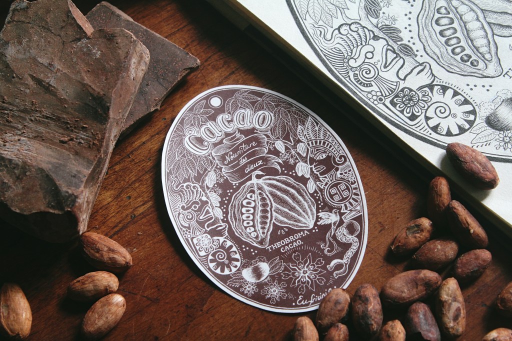 L’étymologie du nom du Cacaoyer « Theobroma cacao » est Theo pour dieu et broma pour nourriture. Cet nourriture des dieux qu’est le Cacao, est issu de cet arbre à la particularité d’être cauliflore, c’est à dire que les fleurs poussent directement sur le tronc, ce qui est très beau. La fleur est si jolie et complexe que j’ai choisi de la dessiner comme une figure géométrique (sous la cabosse de Cacao).