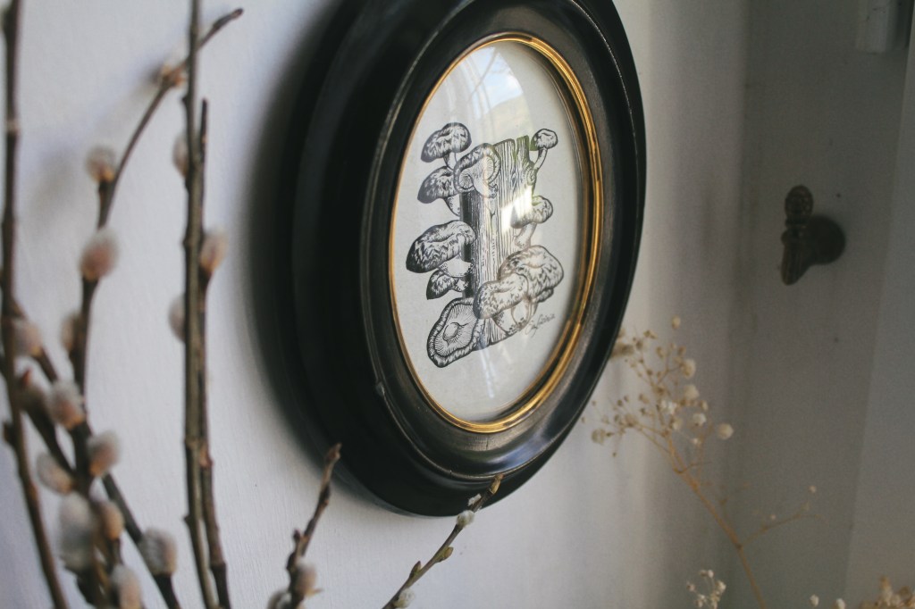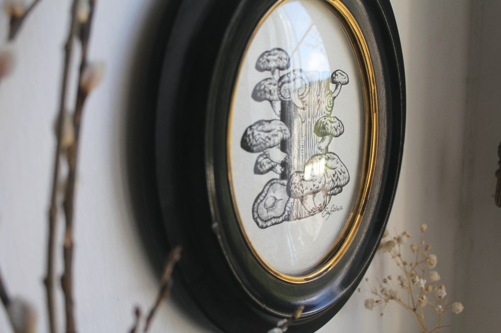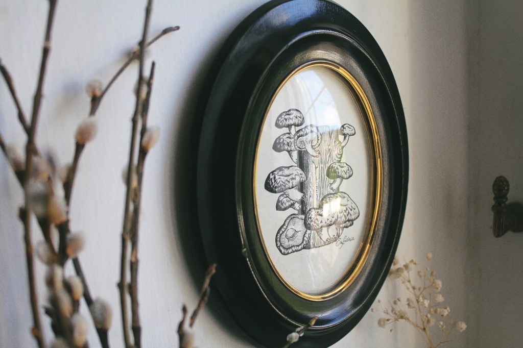 Pièce Unique, Champignons Shiitake sur buche de bois, Impression sur papier artisanal dans cadre ancien style Napoléon III pour remplir vos compositions de Cabinet de Curiosités.