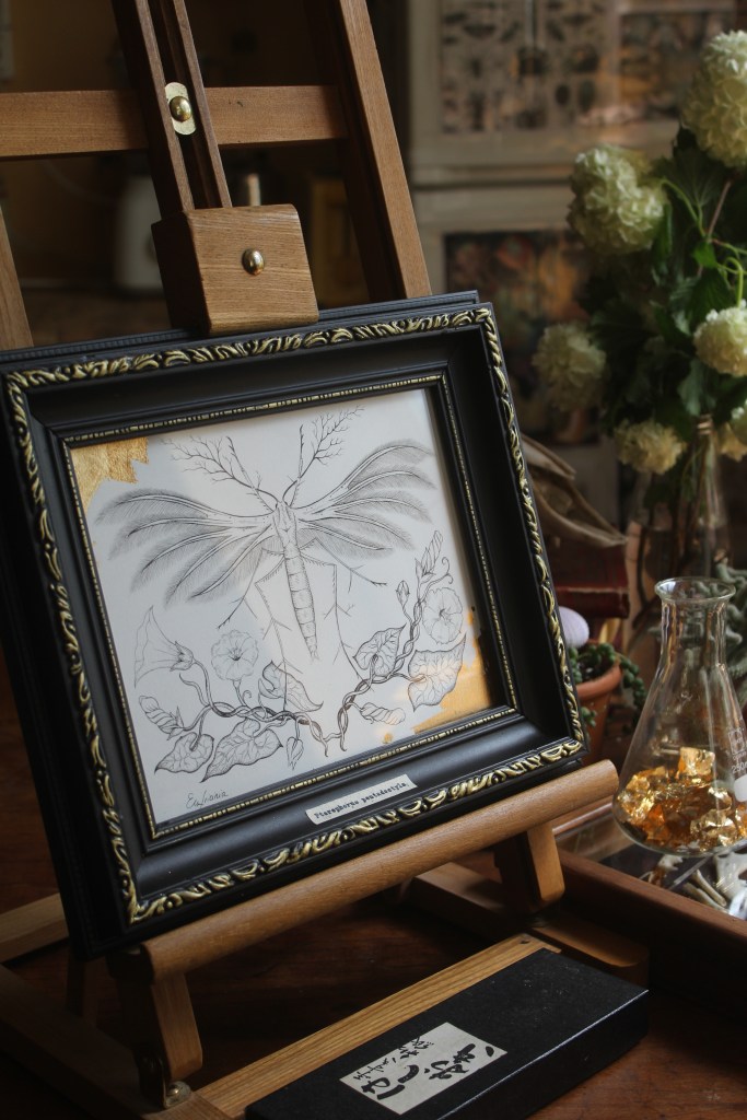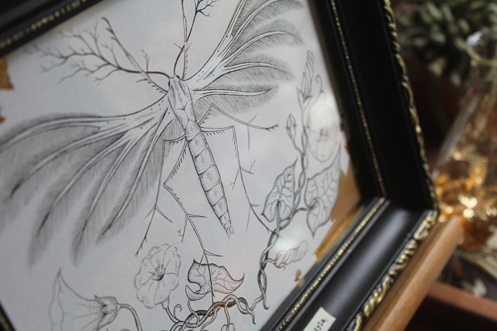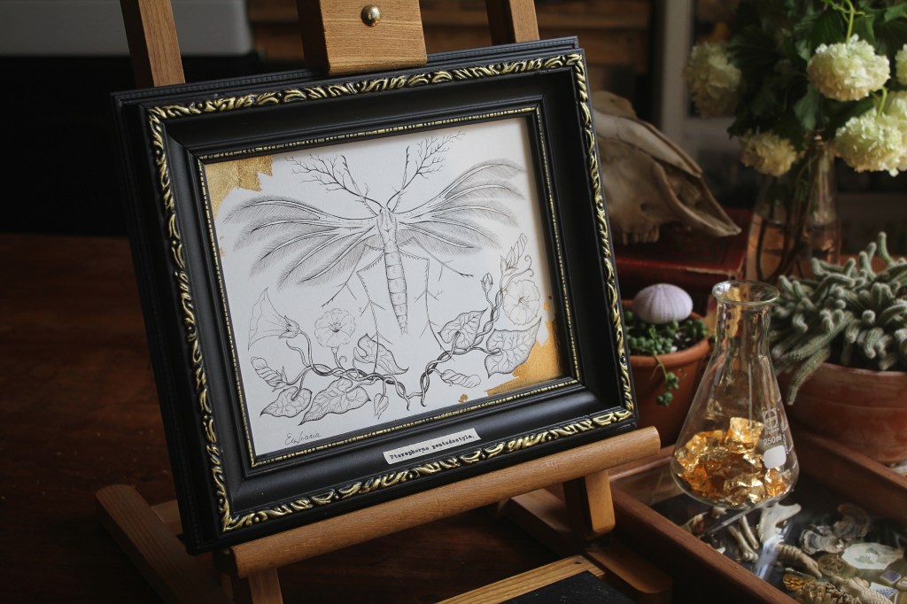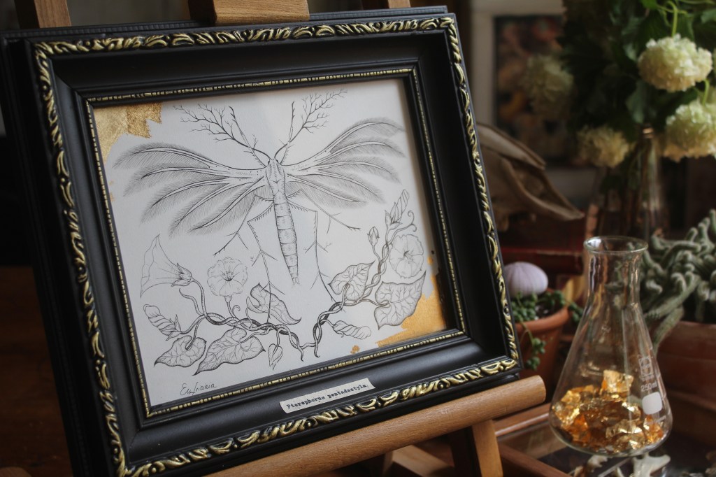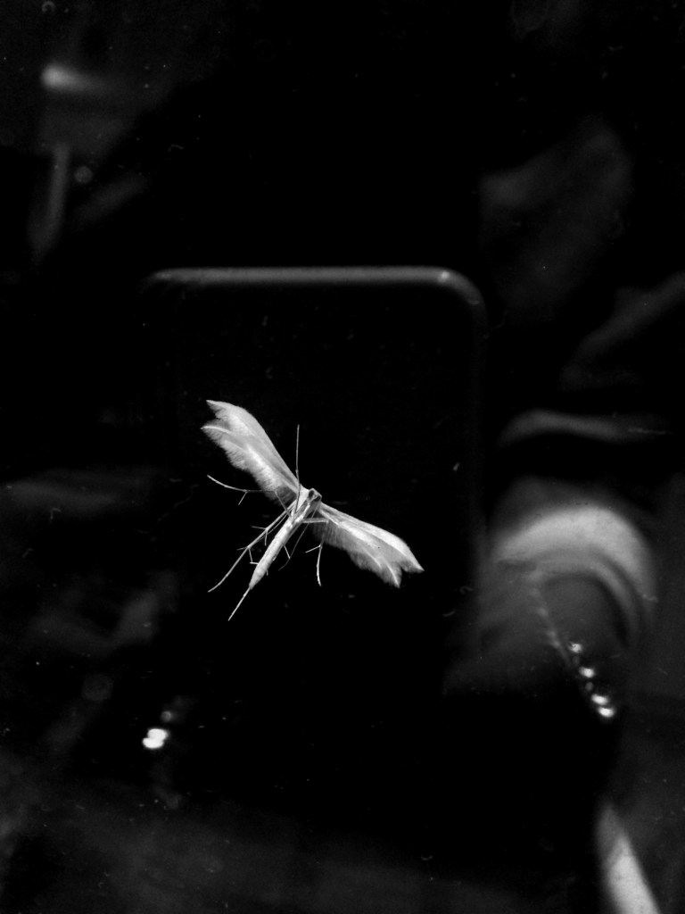 C’est parti de cette rencontre un soir, en apercevant cette sorte de petit papillon blanc à la fenêtre. En m’approchant, je me rends compte de la beauté de ses ailes. De véritables plumes irisées. Je m’empresse de le prendre en photo, pour savoir ce qu’il est. C’est un Ptérophore Blanc, un papillon au nom vernaculaire de Petit Ange de Nuit. Svelte, aux pattes longues et aux ailes d’aspect plumeux d’un blanc neige. Il ne vole que durant un court instant, puisque si léger, il est transporté par le vent. Déposé dans la végétation, il passe pour une brindille avec ses tiges qui lui poussent sur les membres, accentuant son aspect végétal. Sa chenille s’alimente de Liseron et sera son hôte jusqu’à sa chrysalidation.