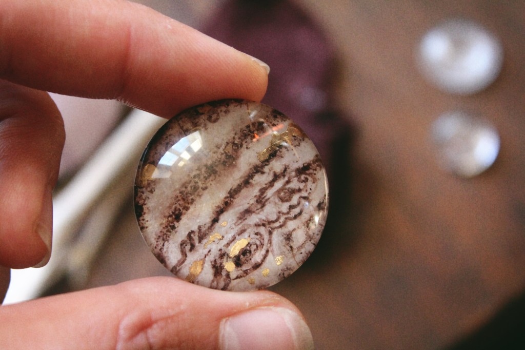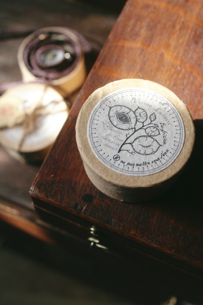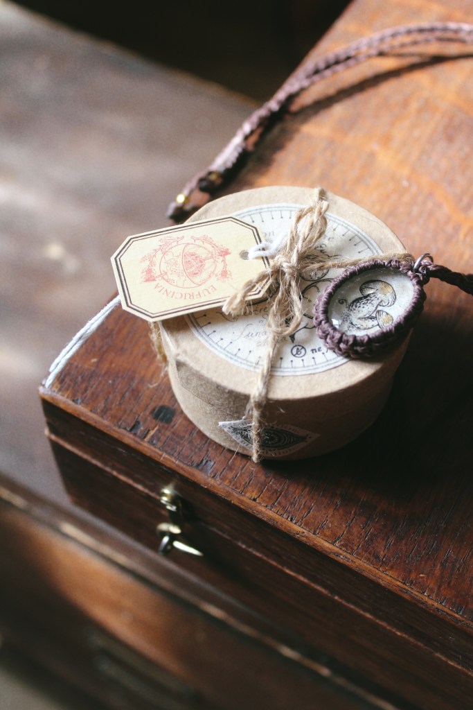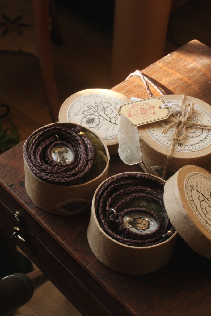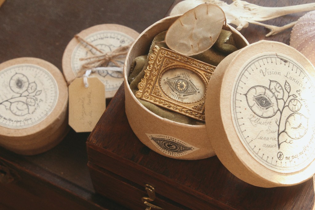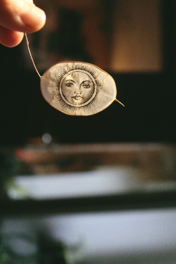 Mais que renferme cette boîte ? J’ai dessiné sur les silicules de la plante Lunaria annua, pour en faire des amulettes. J’ai gardé l’aspect translucide et cette membrane irisée illustrée laisse toujours passer la lumière. L’effet nacré des parois faisant penser à l’éclat de la Lune, d’où son nom « Lunaire »?