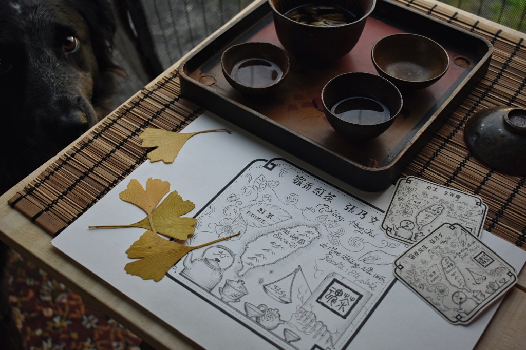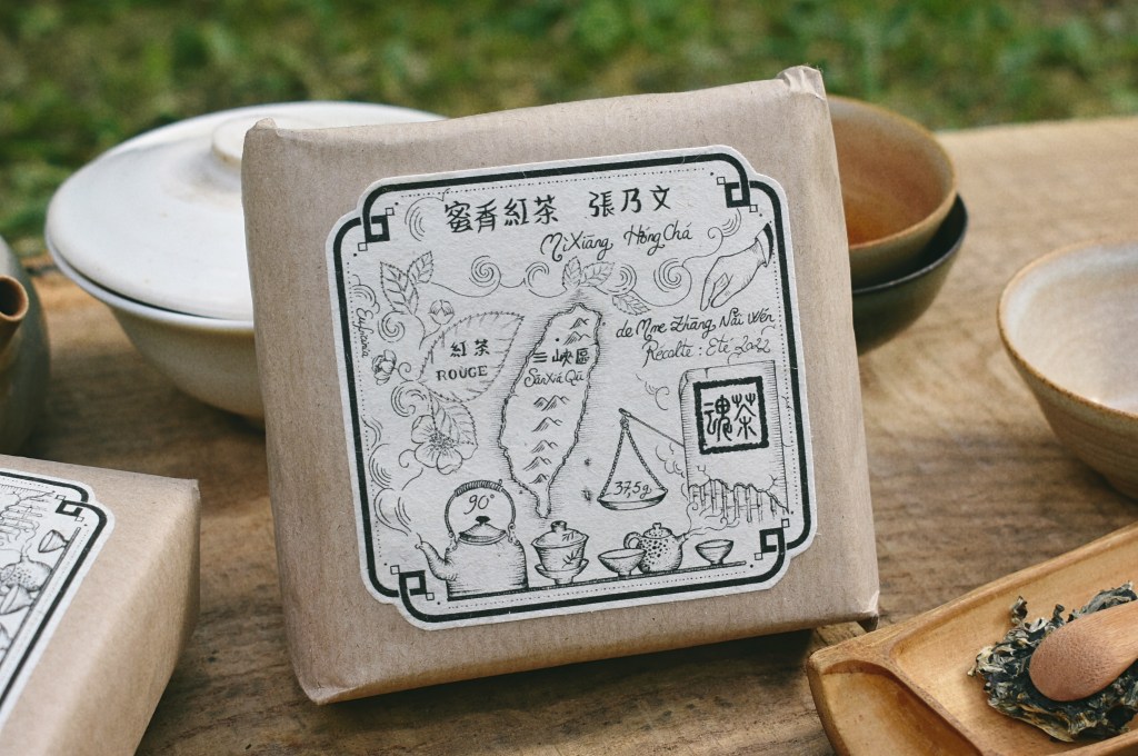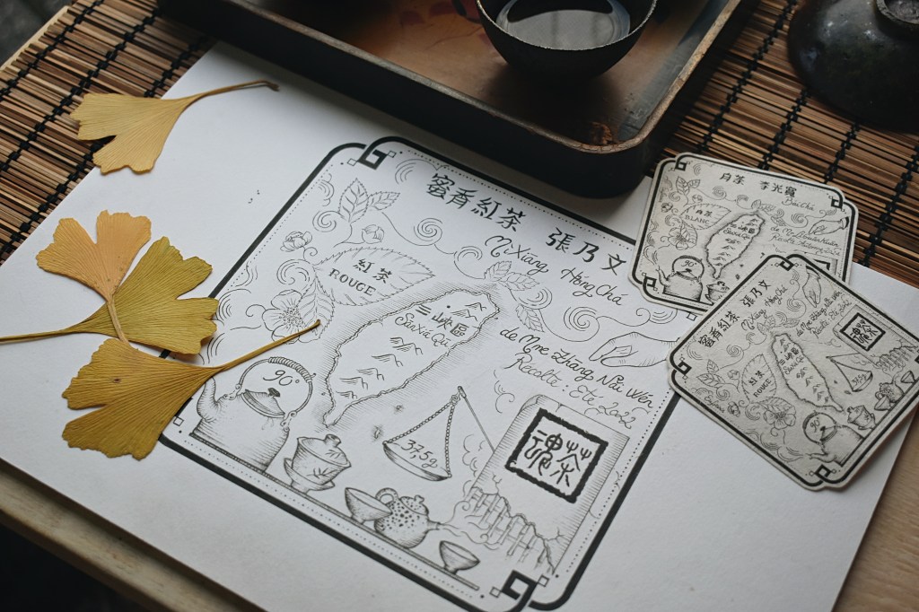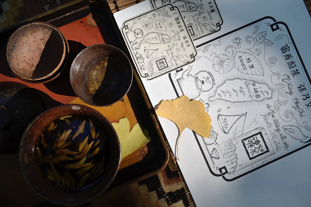 Sur l’étiquette illustrée, les arômes, feuilles & fleurs du Camellia sinensis, se développent dans le nuage de fumée vaporeux, émanant de la théière, dans laquelle on peut lire : 90°, température de l’eau d’infusion. Les sinogrammes sont pour moi des illustrations symboliques que je dessine. Une ancienne balance chinoise d’apothicaire sert à indiquer la quantité de thé que comprend le paquet, et une main qui cueille pour désigner le ou la propriétaire des cultures.