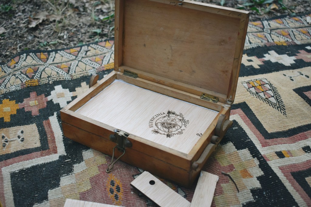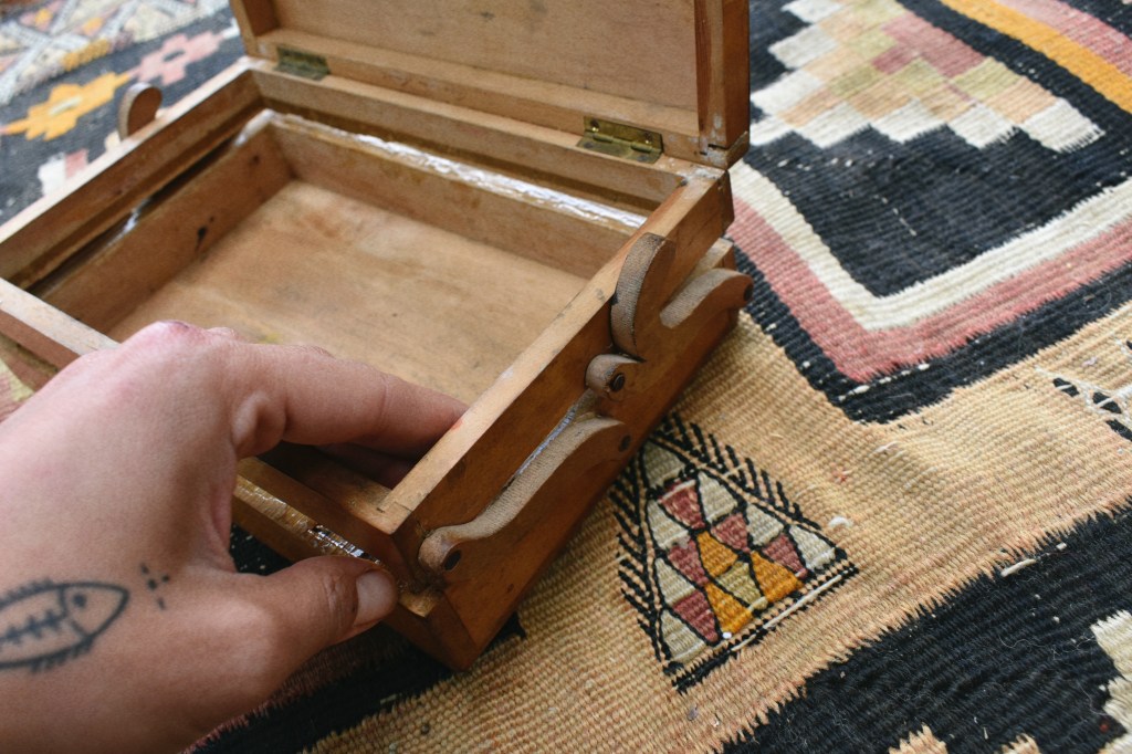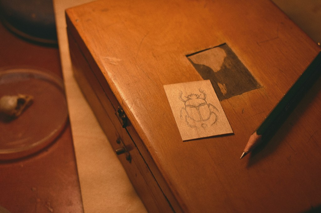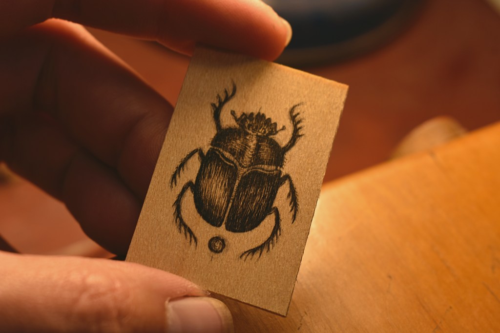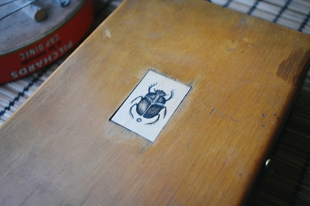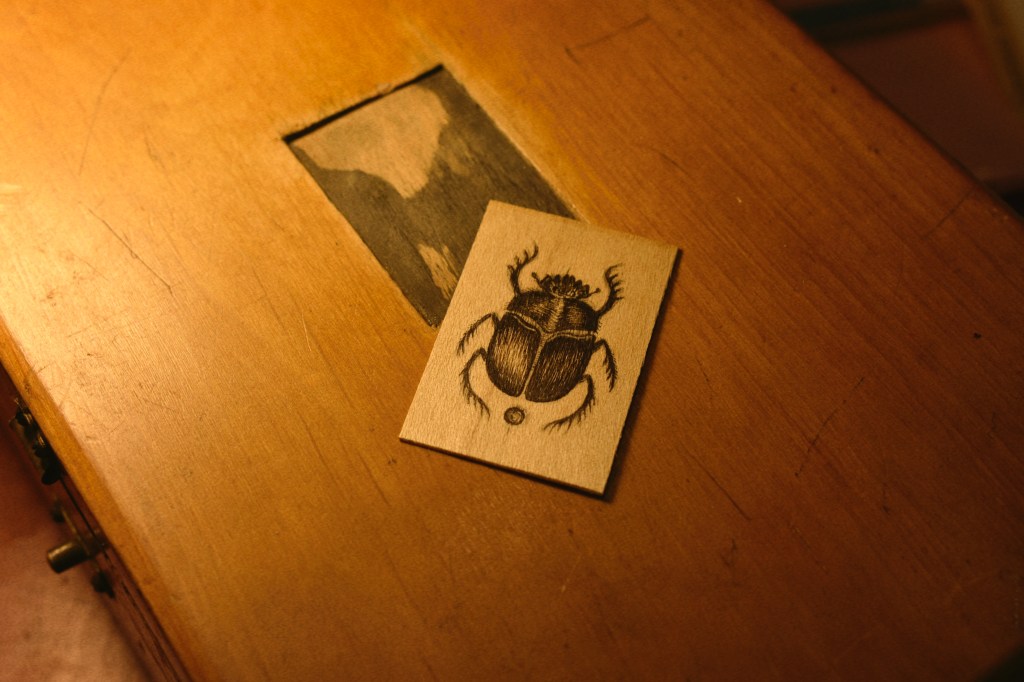 Je suis en Bourgogne chez un ami où les idées fusent. Des énergies créatrices se croisent dans un atelier rempli de machines et techniques, titillée par l’envie de tout essayer. Par exemple, sculpter de l’os, ou travailler le cuir, et un léger début de marqueterie, illustré du Scarabaeus sacer sur la fine feuille de bois et incrustée sur le haut de la boite. Chargées de belles énergies je suis prête à reprendre la route…