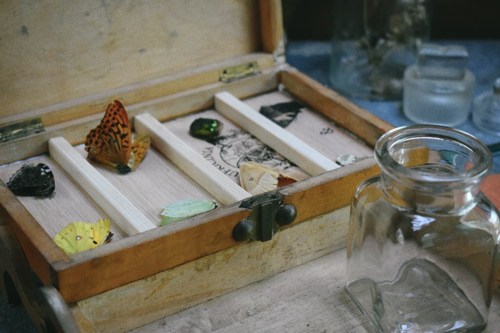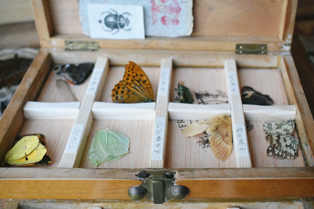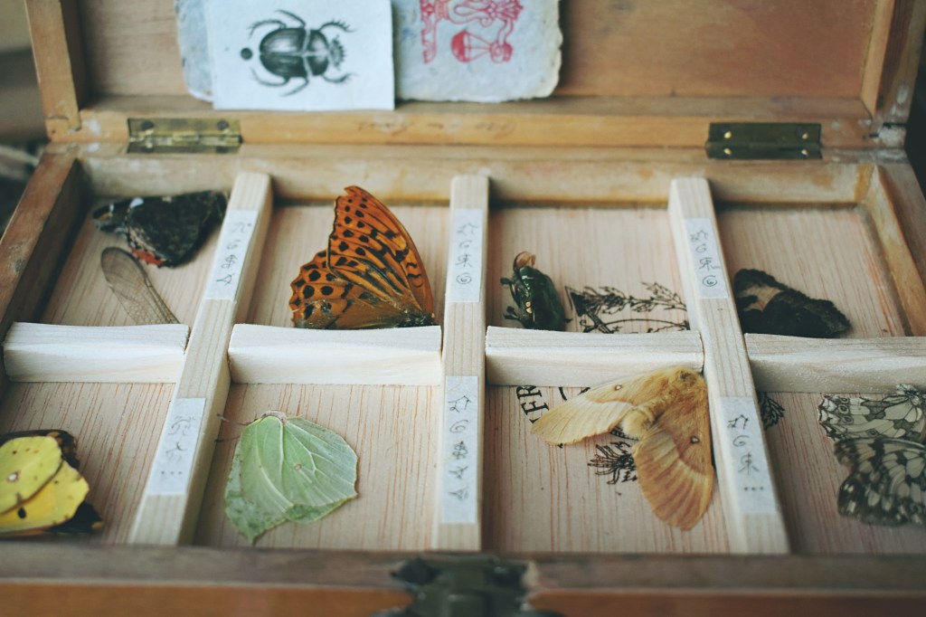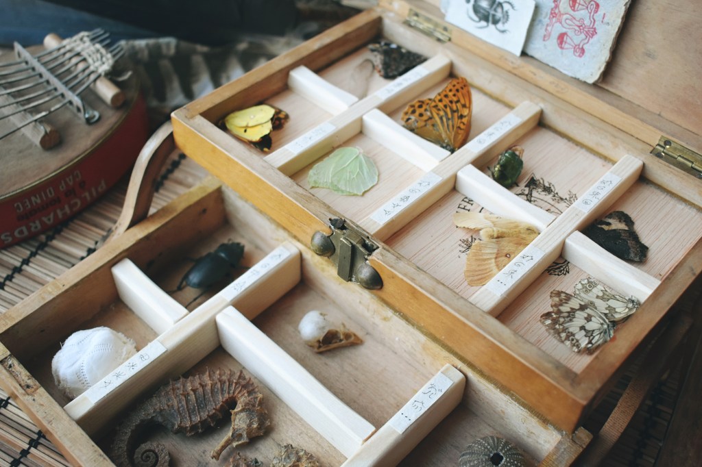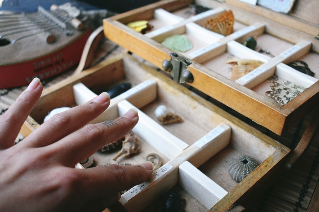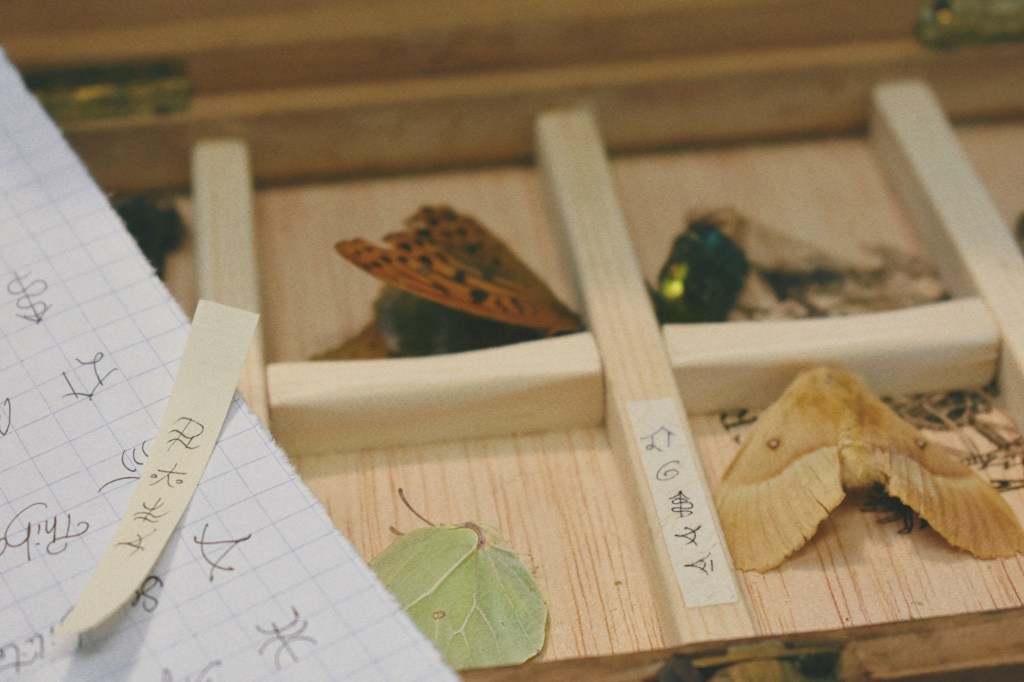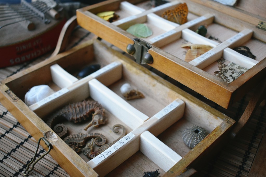 Boîte à étage restaurée et améliorée pour protéger ces délicates inspirations, offertes ou trouvées telles quelles sur mon chemin. L’ébauche d’une écriture inventée par des symboles & caractères pour me souvenir des personnes, lieux, et saisons, liés à ces trouvailles, messagers éclaireurs.