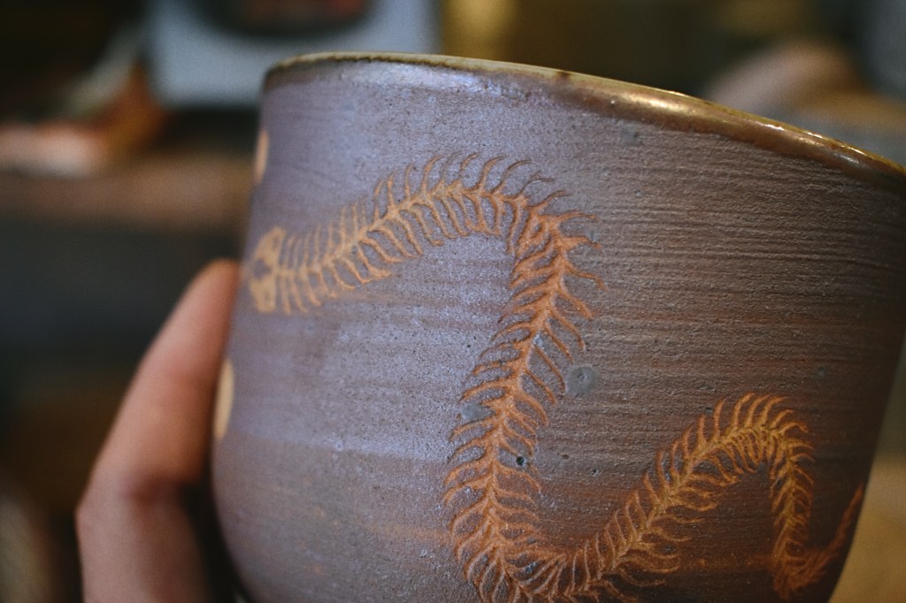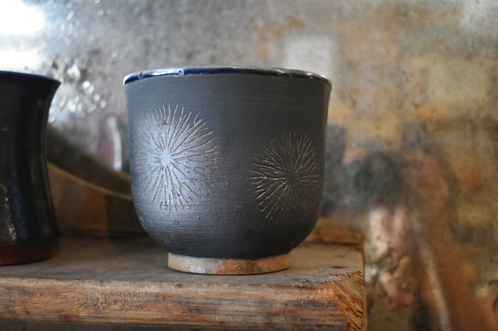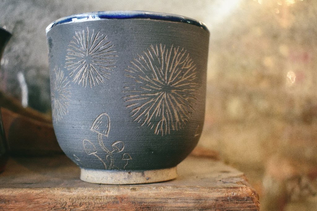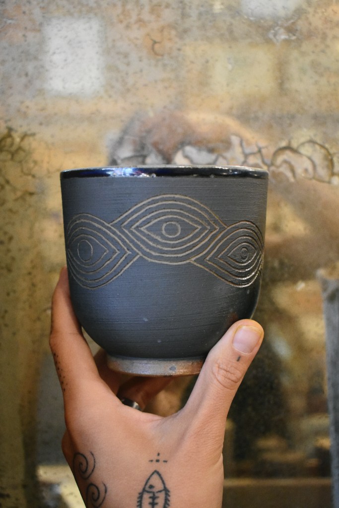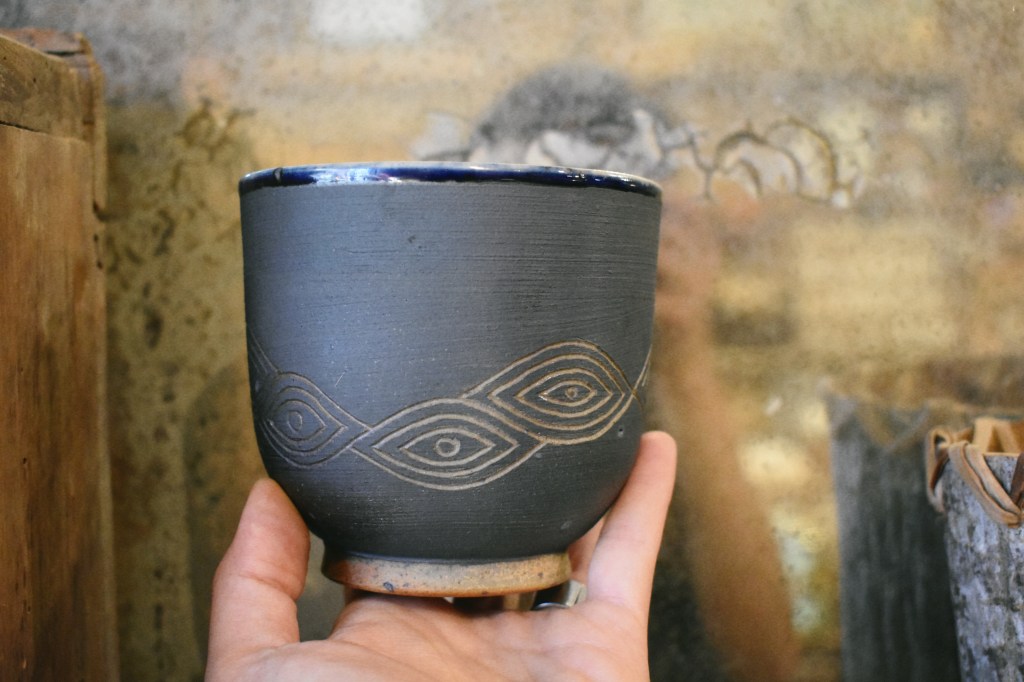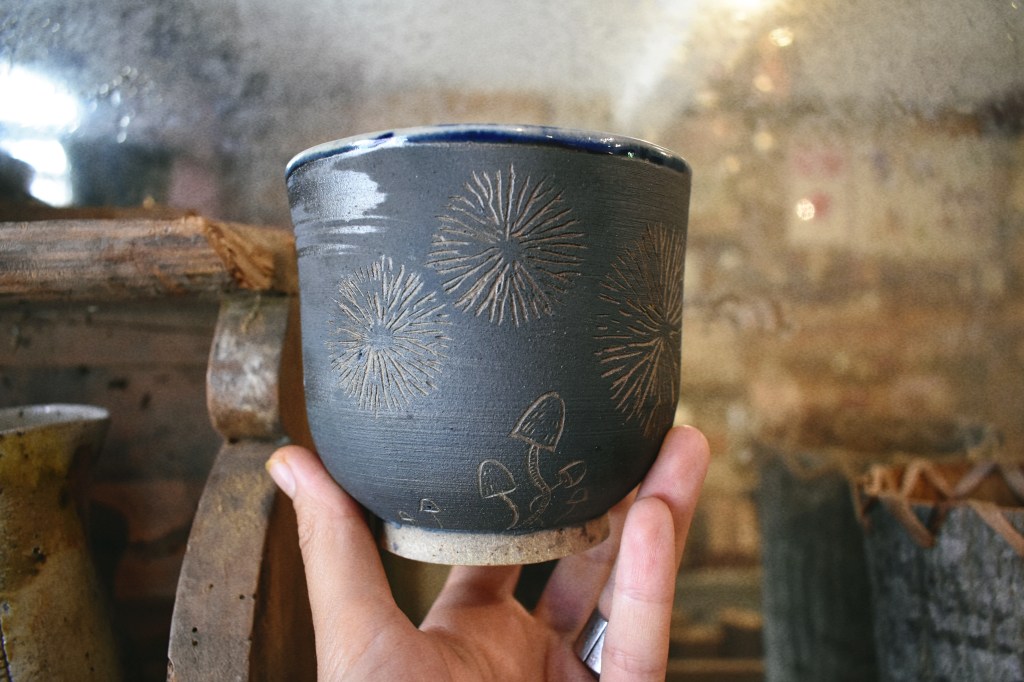 J’ai de nouveau été invitée venir graver une collection de 6 tasses et 2 bols ramen, une inspiration des textures naturelles. Comme je le décrivais dans le premier article, David a construit son propre four à bois en brique dans les hauteurs du paysage ariégeois. Cette construction surmontée d’une grande cheminée, faisant face aux montagnes de forêts, sert à la technique dite Anagama (Japon). Elle demande une grande maitrise tout le long du processus, car la céramique nécessite une pré-cuisson de 20h puis une cuisson de 30h. Jour & nuit, il faut surveiller, alimenter le feu, et veiller qu’à la fin de la cuisson, la température atteigne bien les 1300°.