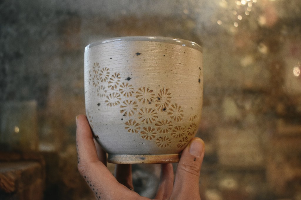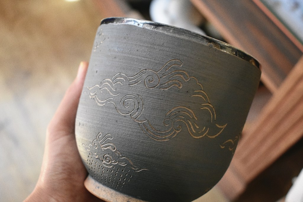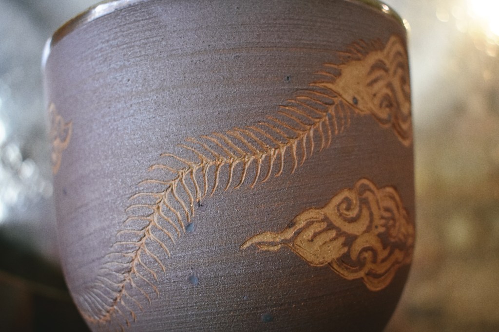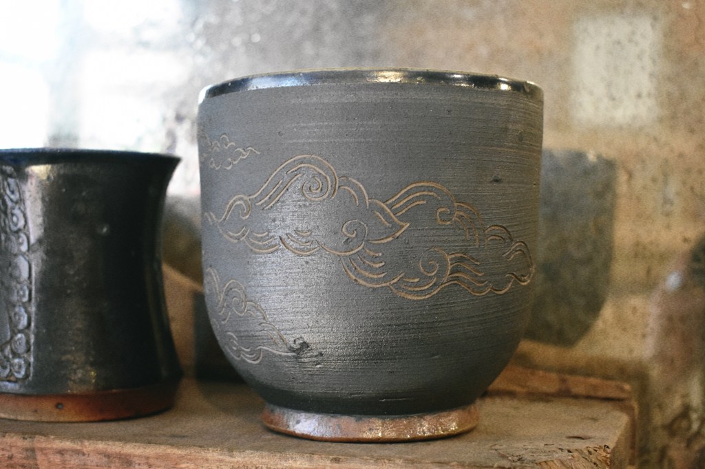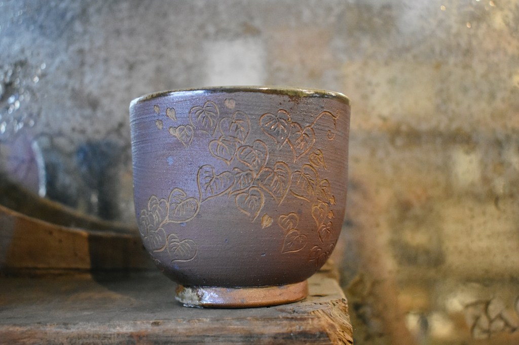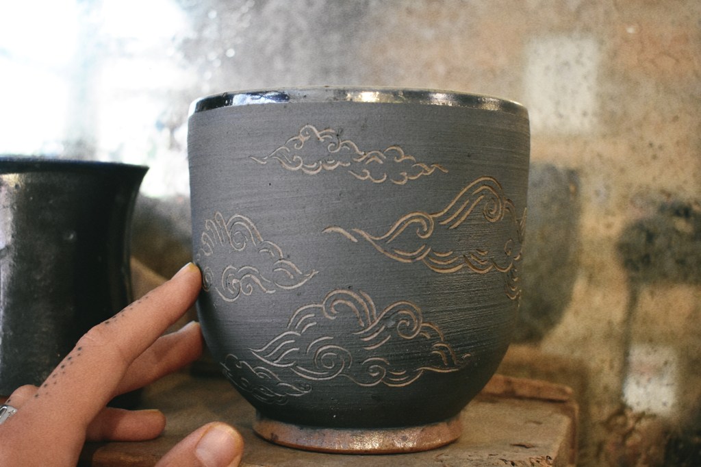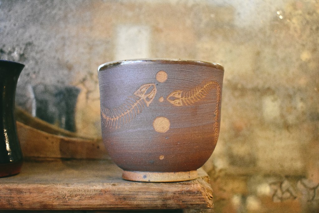 J’ai de nouveau été invitée venir graver une collection de 6 tasses et 2 bols ramen, une inspiration des textures naturelles. Comme je le décrivais dans le premier article, David a construit son propre four à bois en brique dans les hauteurs du paysage ariégeois. Cette construction surmontée d’une grande cheminée, faisant face aux montagnes de forêts, sert à la technique dite Anagama (Japon). Elle demande une grande maitrise tout le long du processus, car la céramique nécessite une pré-cuisson de 20h puis une cuisson de 30h. Jour & nuit, il faut surveiller, alimenter le feu, et veiller qu’à la fin de la cuisson, la température atteigne bien les 1300°.