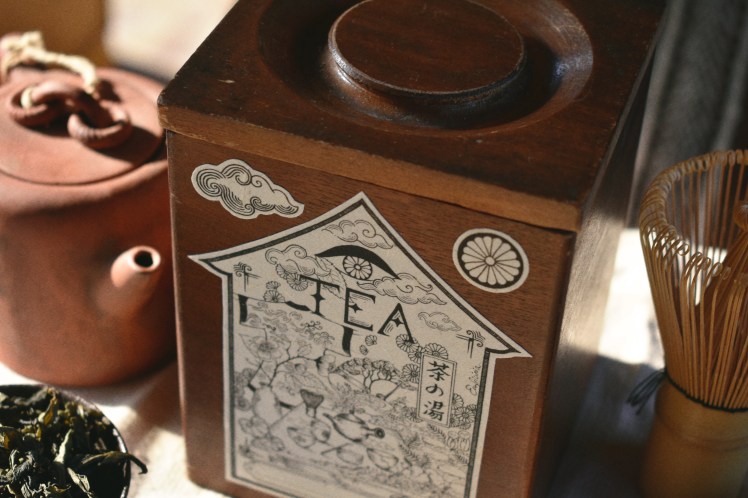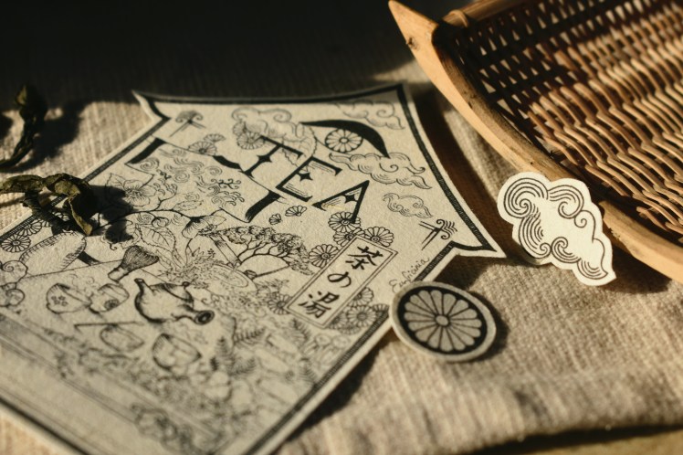 Au Japon, une légende raconte que les feuilles de thé sont les paupières découpées de Bodhidharma. Ce dernier aurait fait le vœu de rester éveillé neuf ans, mais se serait assoupi avant. Il s’en serait tant voulu, qu’il enterra ses paupières, pour que apparaisse au même endroit, l’arbuste de thé dont la vertu est de maintenir éveillé. Voici pourquoi, en haut de l’illustration, l’œil éveillé, perd sa paupière en feuille de Camellia sinensis. Plante du thé, dessinée juste en dessous, fleurie, et en chabana, un style d’arrangement florale spécialement créé pour la cérémonie. À droite du vase la contenant, la table réunissant l’art du thé, dont je ne vous liste pas les différents ustensiles, car très codé. Seule une personne expérimentée peut pratiquer la cérémonie, et porte un kimono lors de son déroulement. Vous en trouverez un, représenté derrière le vase. Et si l’on suit cet arrière plan vers le jardin, on remarquera le tsukubai. Petit bassin d’ablution où l’on se penche pour se laver mains et bouche avant la cérémonie. Le chemin y menant est bordé de statuettes Jizô, et ainsi vous pourrez quitter tranquillement l’étiquette en forme de pavillon de thé.