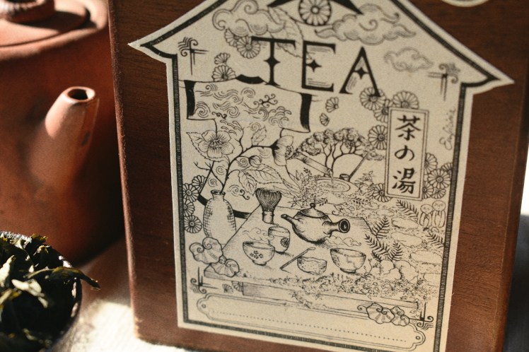 In Japan, a legend says, that the tea leaves are the cut eyelids of Bodhidharma. He made the wish to stay awake nine years, but he fell asleep before. He was so sorry, that he buried his eyelids so that a few years later, appear in the same place, the tea shrub, whose virtue of leaves is to keep awake. That’s why, at the top of the illustration, the awake eye loses its leaf-like eyelid of Camellia sinensis. The drawing of the Tea plant just below, flowery, is in chabana style, a floral arrangement specially created for the ceremony. To the right of the vase containing it, the table bringing together the art of tea, which I do not list the different utensils, because it is a very coded art. Only an experienced person can do the ceremony, and wear a kimono during its course. You will find one, represented behind the vase. And if we follow this background towards the garden, we will notice the tsukubai. Small basin of ablution where we lean to wash hands and mouth before the ceremony. The path leading there is lined with jizō statuettes, and so you can quietly leave the label in the form of a tea pavilion.