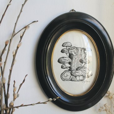 Pièce Unique, Champignons Shiitake sur buche de bois, Impression sur papier artisanal dans cadre ancien style Napoléon III pour remplir vos compositions de Cabinet de Curiosités. Dimensions : 19 x 15 cm Impression sur Papier Artisanal Cadre en bois, Verre Bombé, Cerclage en laiton doré Traces d’impacts sur le bois faisant partie de l’histoire de … Lire la suite Cadre Napoléon III – Shiitake